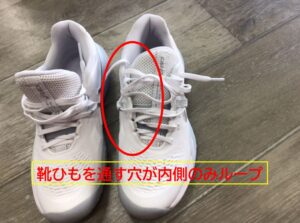 足首に近いところに穴がなく、内側についているループに紐を通してしばる形状となっています。