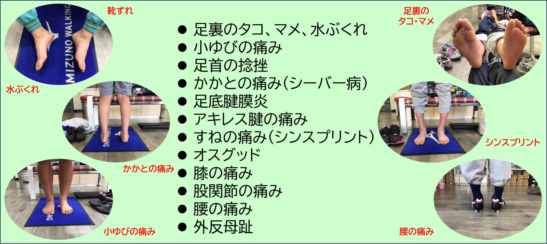 - 靴選び: スポーツにおける足のトラブルを避けるには、自分の足に合った靴選びがとても大切です。 足に合わない靴は、さまざまな足のトラブルや体の不調、怪我を引き起こす可能があります。